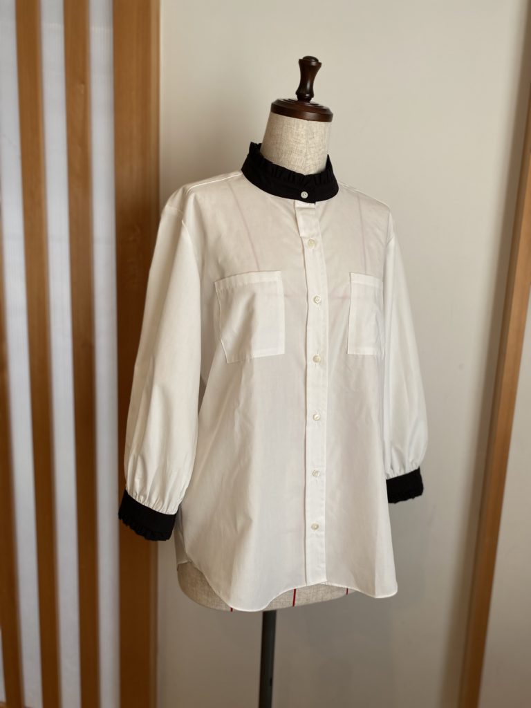 こちらの生地でキレイめなオフィスカジュアル系ブラウスとフォーマルな子供用の白シャツを作りました。