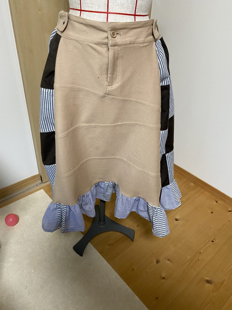そうするとウエストベルトも足りなくなるので、上の写真のチノパンから布を取って、スカートの寸法に合うようにベルトを作りました。