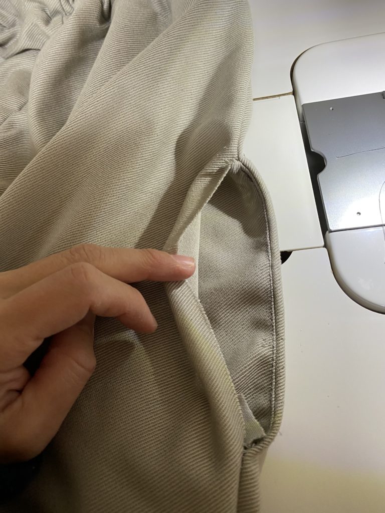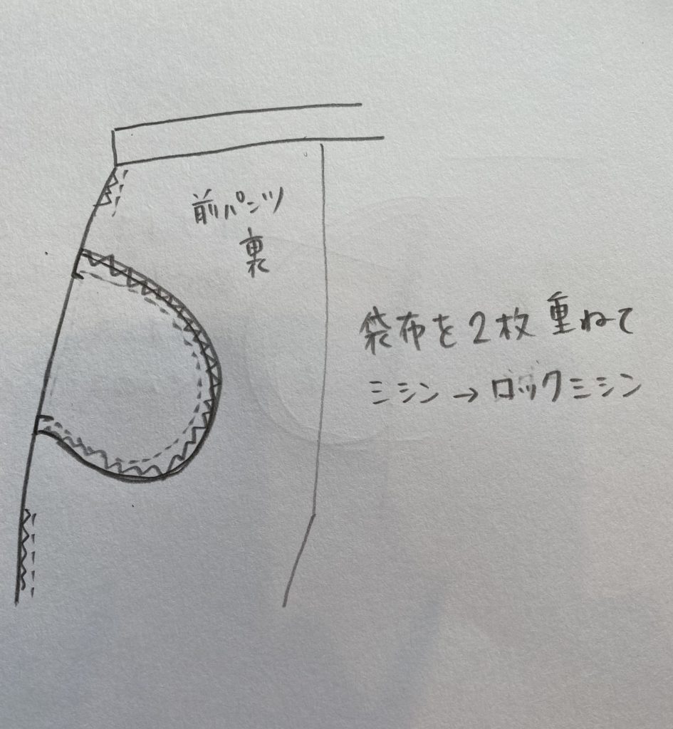 (このズボンはニットなのでロックミシンのみですが、布帛生地の場合は、直線ミシンしてからジグザグかロックミシンしてください)