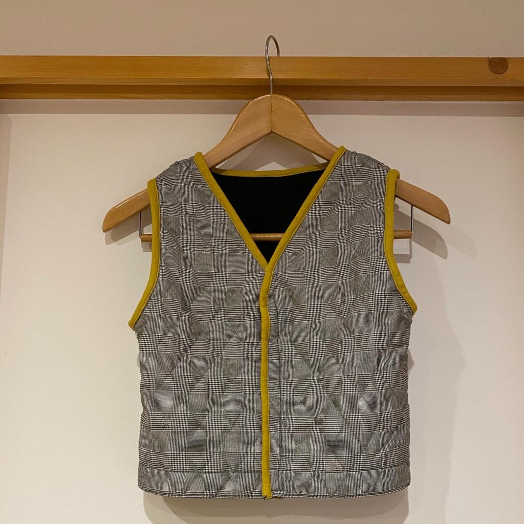 でと捨てる前にもう一度何かに使えないか考えてみたところ、子供用のベストならちょうど生地も足りそうだし柄もまぁイケるかなと思いまして。