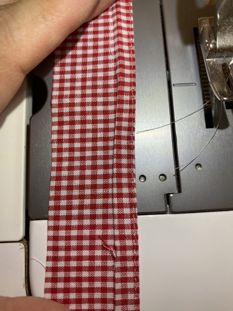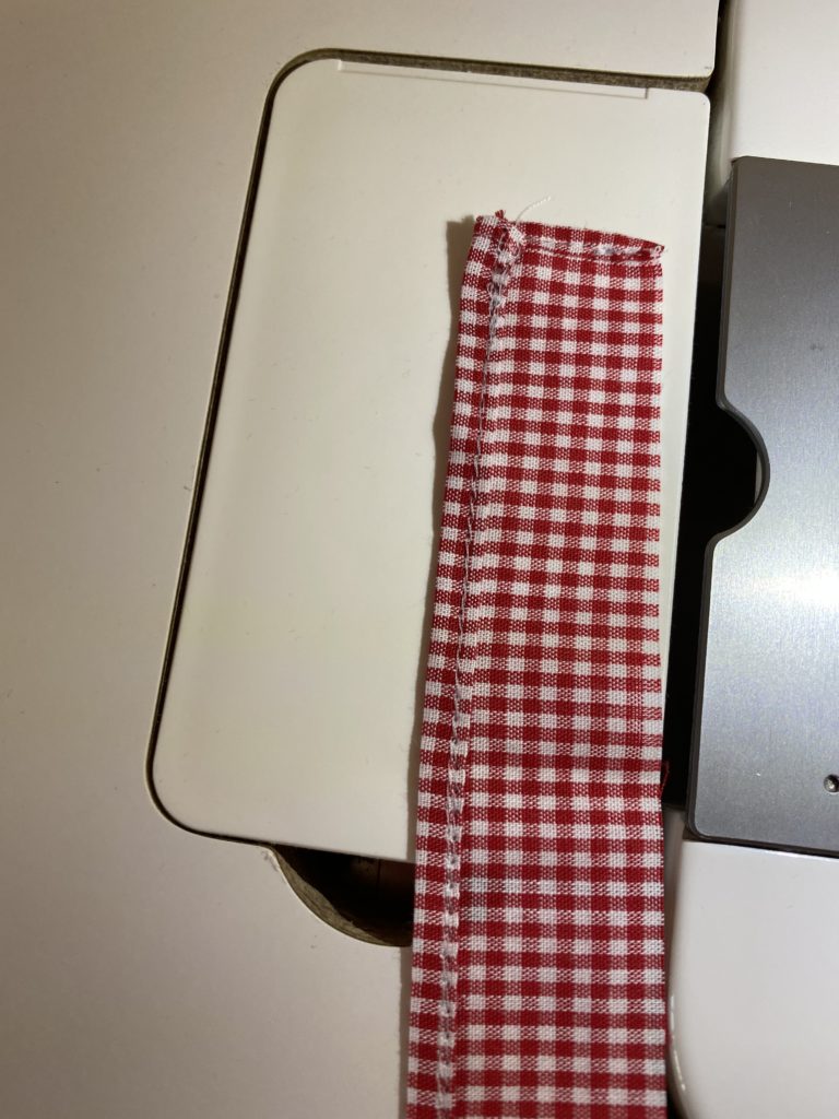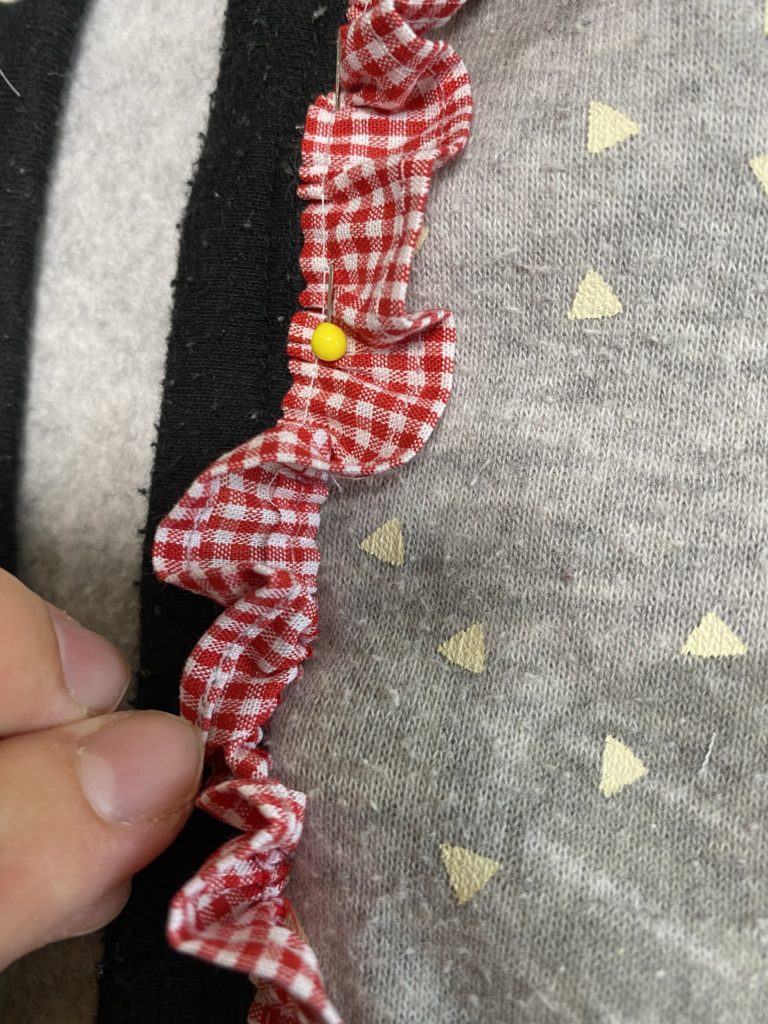 赤チェックのハギレでフリルを作ります。