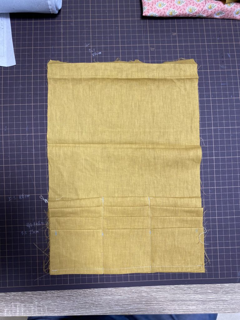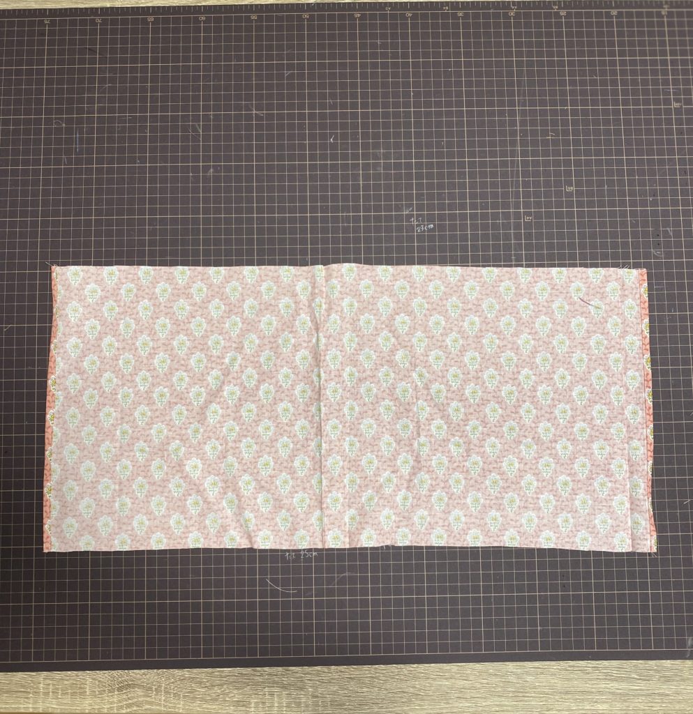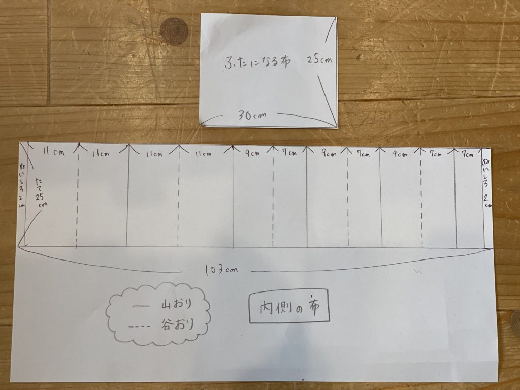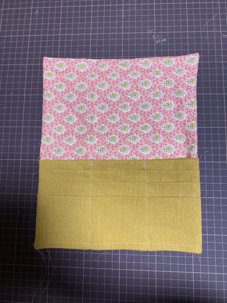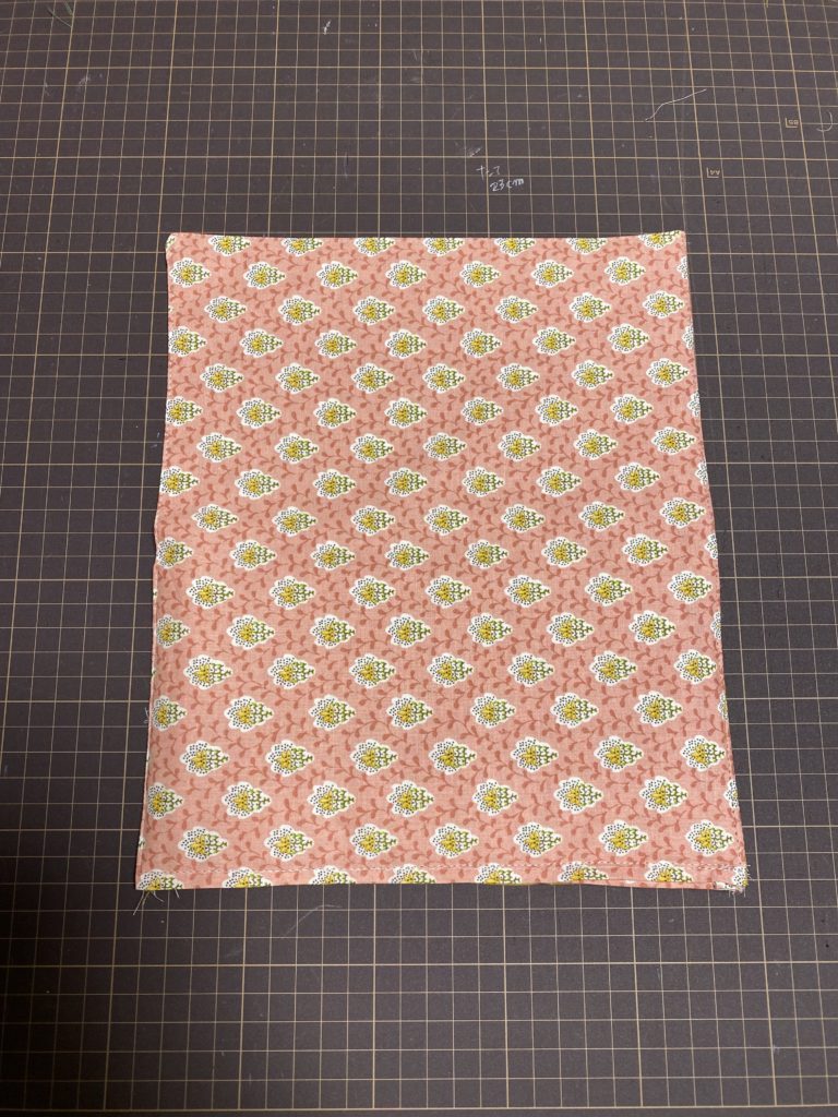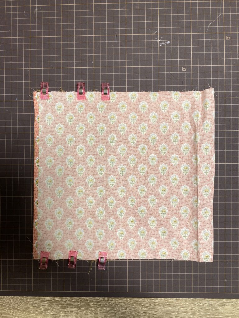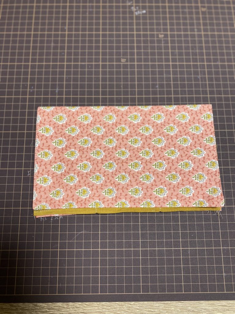 そして蓋になる布で内側の布を挟んで二つ折りして、両脇を縫います。