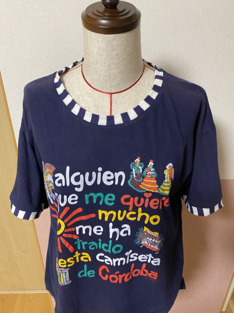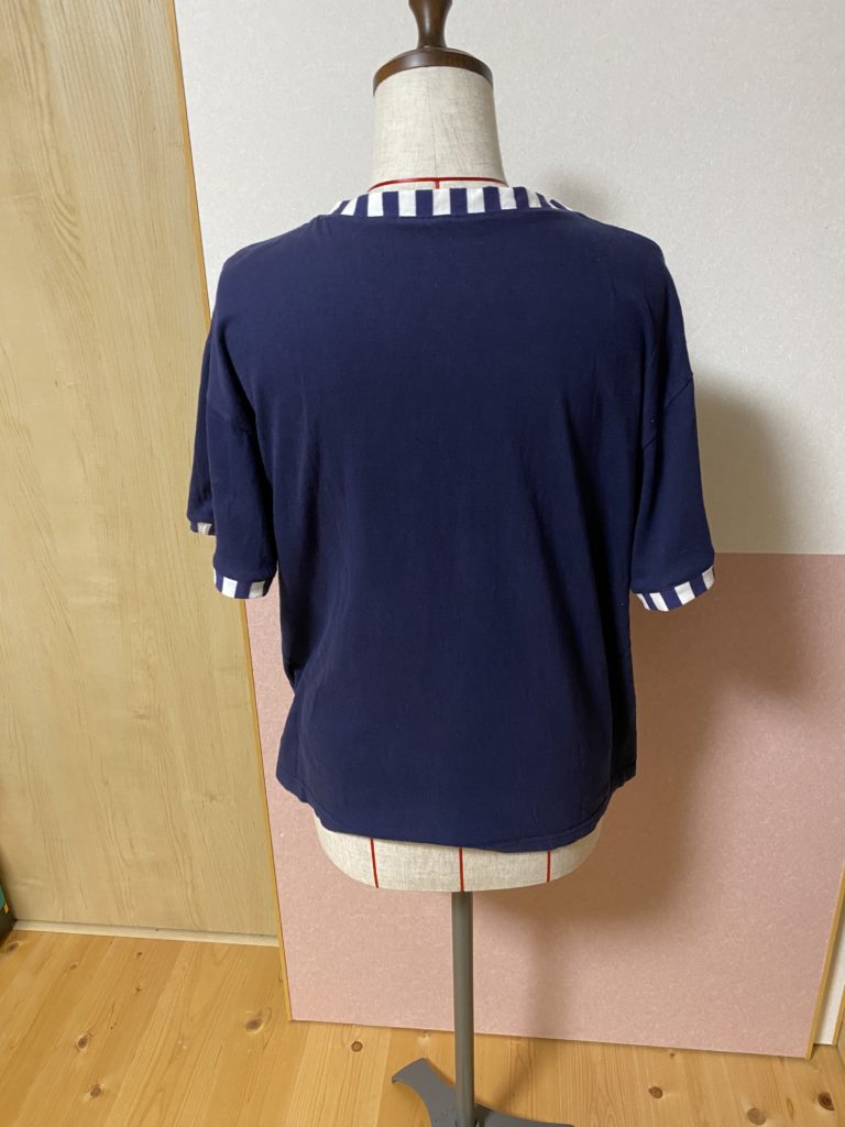 今回は、依頼主の古着屋さんより、衿が少しヨレヨレしているので、他のTシャツのハギレを使ってリンガーTシャツ風にアップサイクルしてほしいとご依頼いただきました。