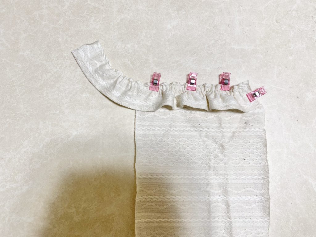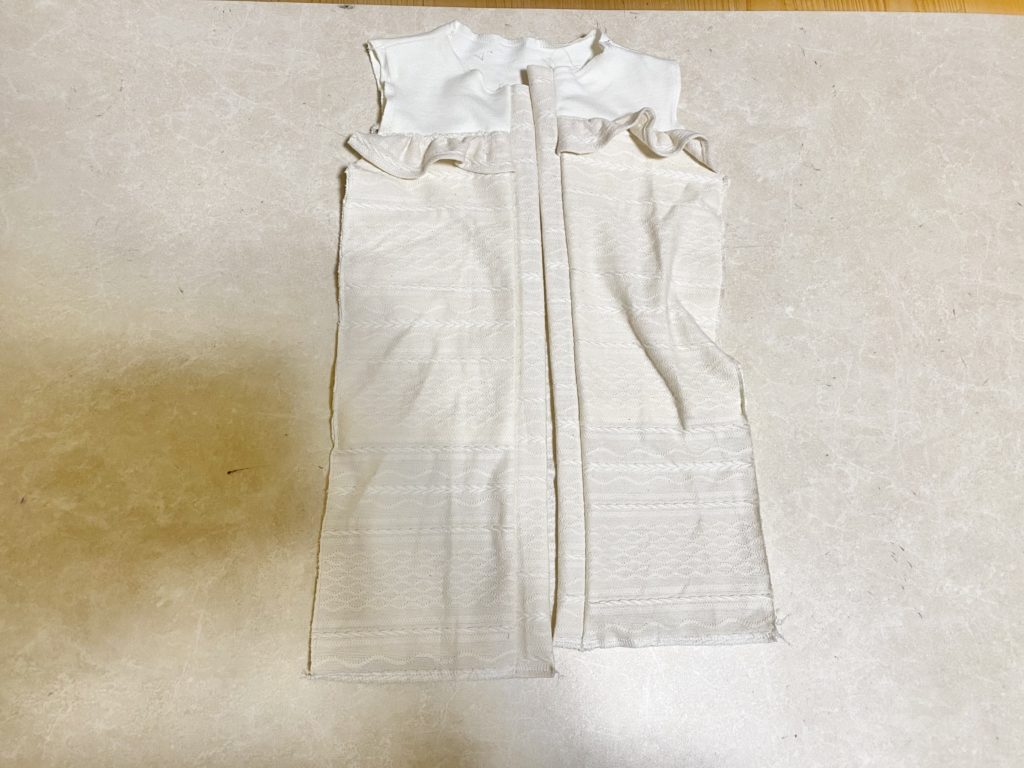 もう一つの生地をカットして前見頃、後ろ見頃、フリル用にします。フリルと見頃をまずロックミシンで縫います。