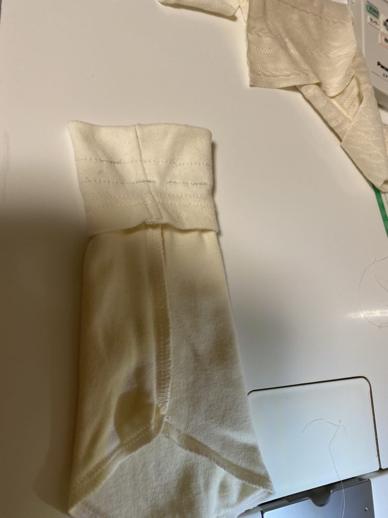 袖口にゴムを通すため、二つ折りにして袖から2cm、3cmのところをぐるっと縫います。